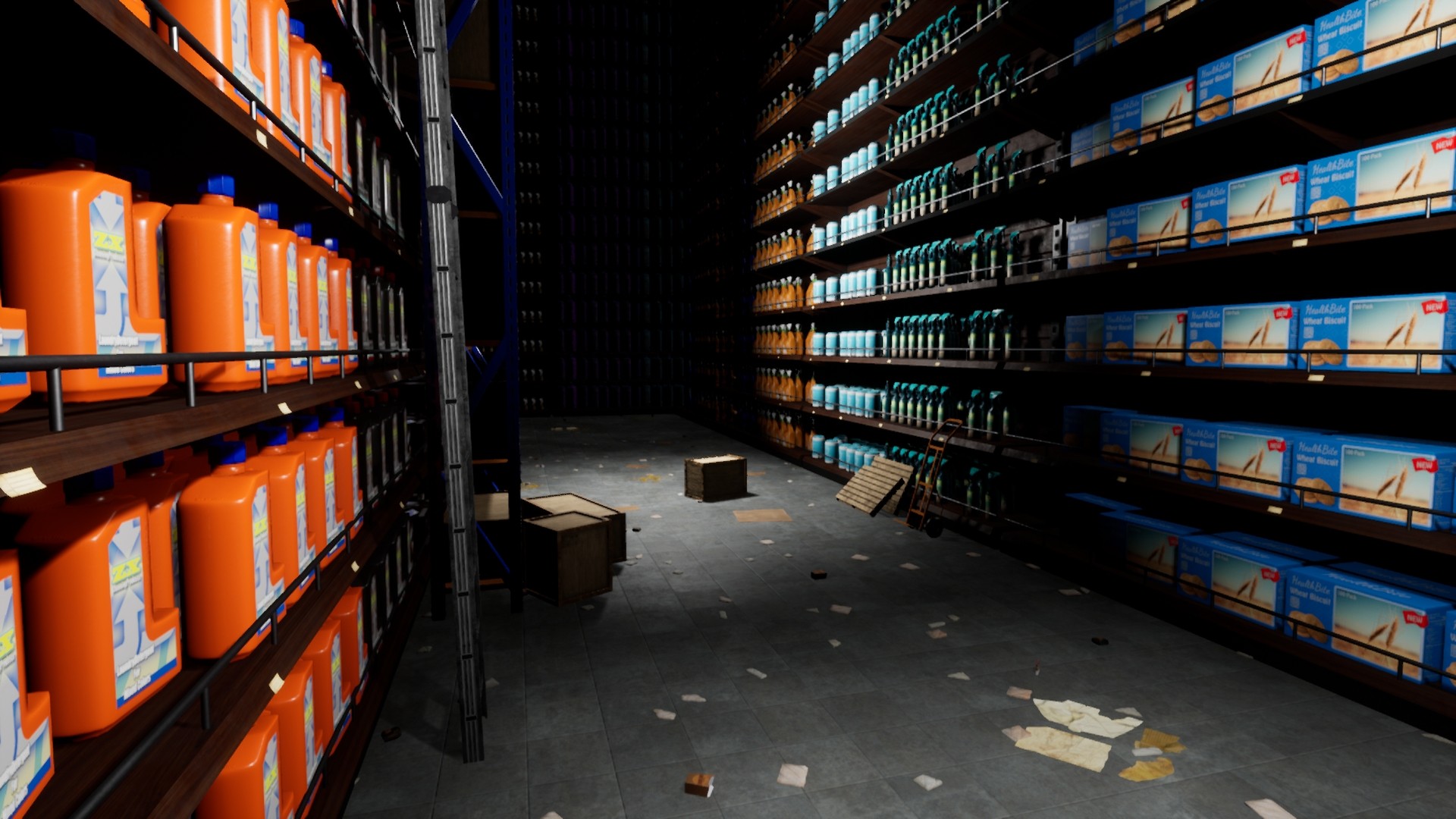 Уровни выполнены как типичные детские страхи. Пустой старый дом с привидениями, хоть ни одного призрака здесь и нет. Склады и продуктовые полки что нависают сверху когда мама забыла тебя на кассе или потеряла среди лабиринтов гипермаркета… Это отличный способ напомнить игроку, чего он мог бояться раньше. Что может пугать его прямо сейчас.