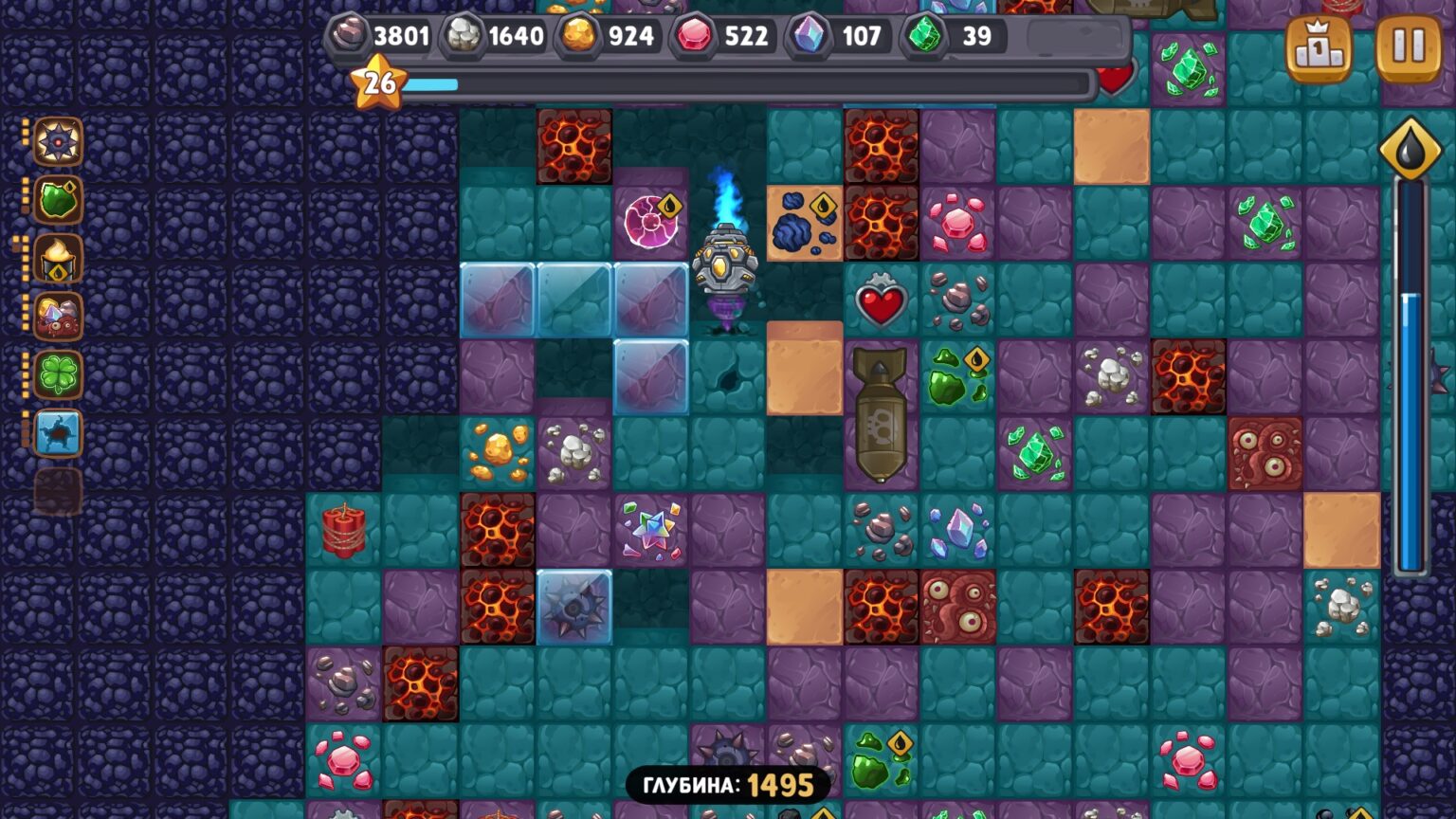 🟡 Интерфейс. Понятный, удобный, только иногда не хватало отображения здоровья над буром, чтобы понимать можно ли сейчас рискнуть. И не сразу ясно, зачем собирать монетки.