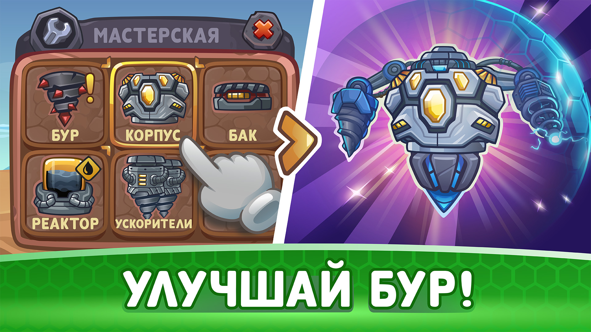 Возьмите на себя управление настоящей буровой установкой! Начните с маленького бура на угольном реакторе, и сможете превратить его в непробиваемый танк, чтобы двигаться напролом сквозь мины и лаву! Или обзаведитесь ядерным двигателем вместе с причудливыми инструментами для сбора ресурсов, и сможете позволить себе любое улучшение! А что, если самому стать передвижной бомбой и устроить настоящее веселье с разрушениями и взрывами? Узнайте, какая тактика и стратегия позволит Вам занять первую строчку среди лучших игроков и заслужить звание легендарного охотника за сокровищами!