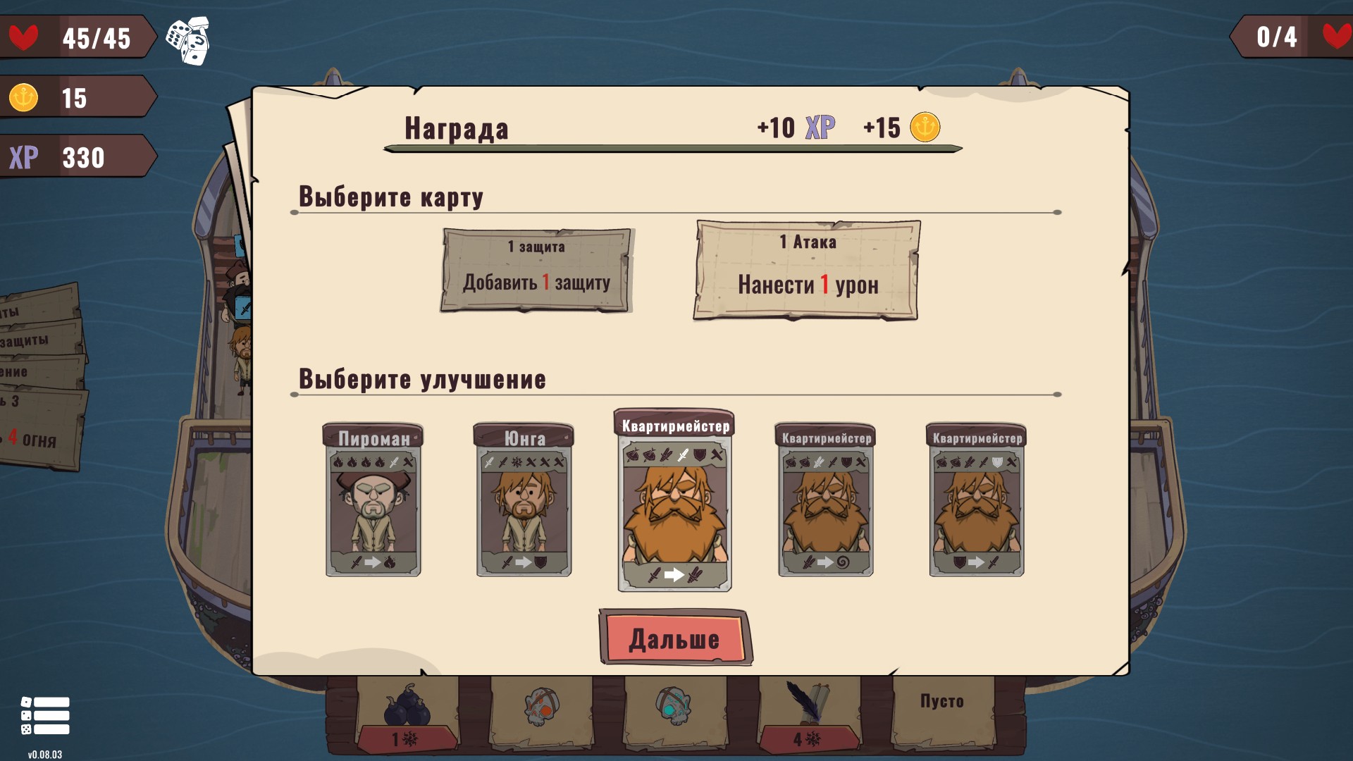 Вот это очень хорошо, самое важное можно проходить огромное кол-во раз, можно отлететь на втором корабле, квесты приятные, в общем тут всё по закону жанра, да рандом в кубиках, но с помощью получения карточек мало по малу на них можно влиять, по балансу на данным момент вроде тоже всё хорошо, радует, что нельзя выбрать персонажа у которого одна лишь броня, а то можно было бы поставить 3х в броню, одного в атаку и тыкать прохождение до конца, видно, что проработано. Хотелось бы увидеть больше анимацией персонажей, выстрелов, огня и чего-то ещё, добавить именно жизни в статические картинки, тогда игра станет ещё живее и атмосфернее. Прошёл раза наверное с 5го уже до конца. По звуку сейчас тоже всё приятно и аккуратно.