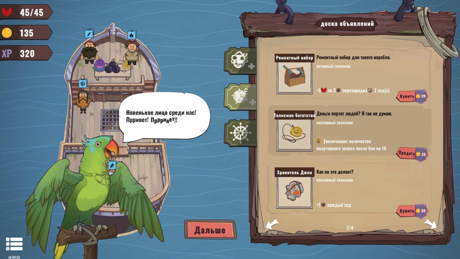Используйте заработанную глобальную валюту, чтобы облегчить свой путь. Инвестируйте в дополнительных членов экипажа, обеспечьте места для мощных талисманов и укрепите прочность своего корабля.