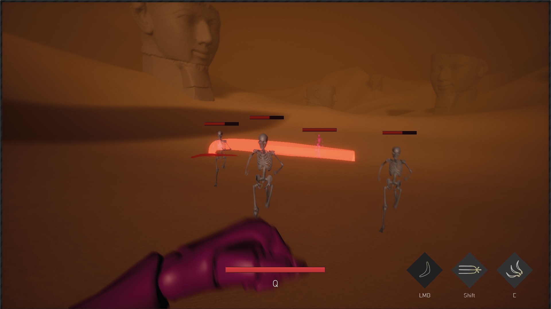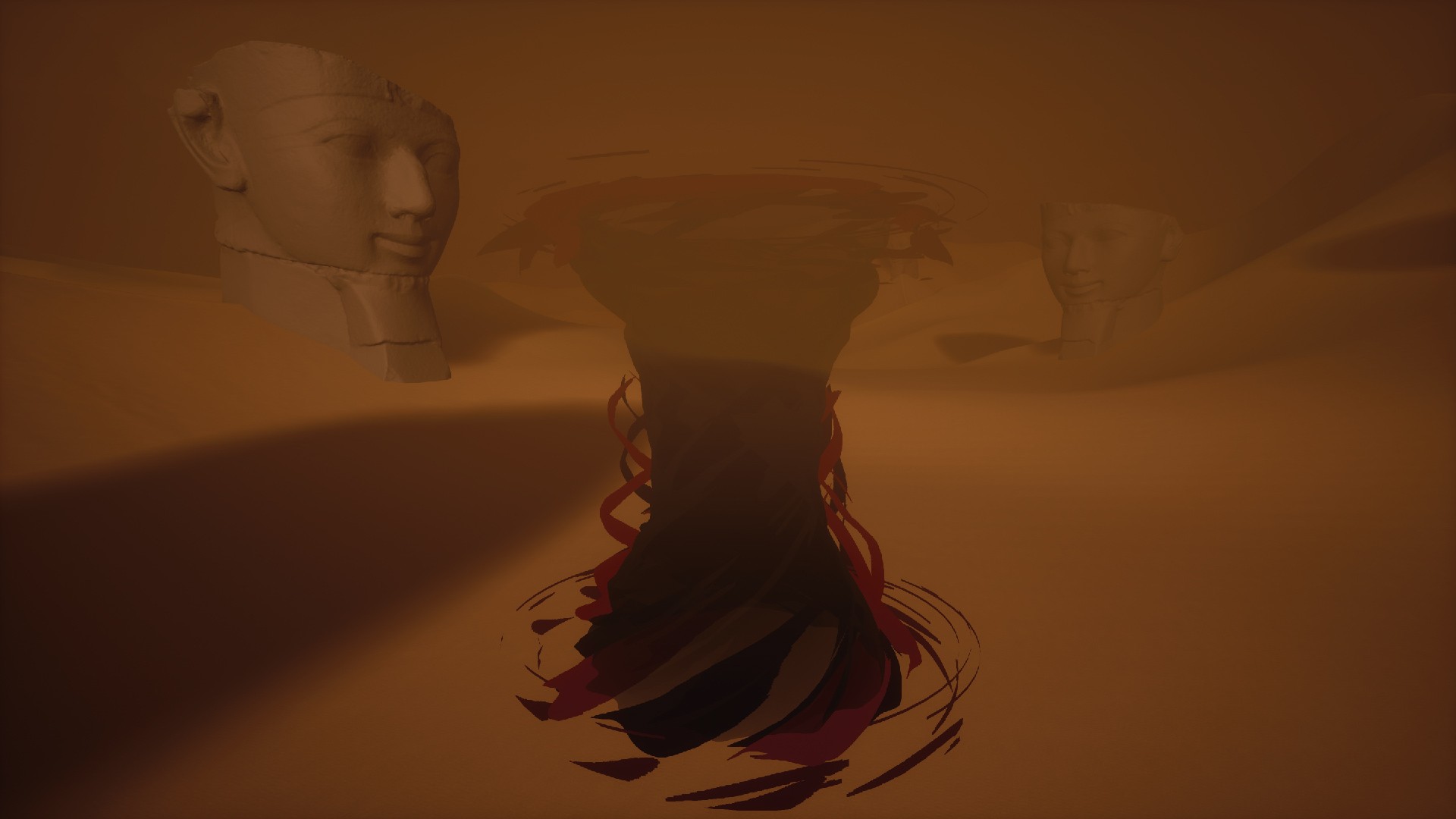 Пока что в игре не хватает древнеегипетского сеттинга, локации пустые. Надеюсь, что в дальнейшем Вы заполните локации архитектурой и скульптурой. Те головы, которые имеются на данный момент выглядят очень странно, во-первых, не понятно что это - часть какой-то большой скульптуры, которая находится под песком, или просто одна голова, а во-вторых, одна и та же повторяющаяся голова каждый условно метр - это признак плохого дизайна.