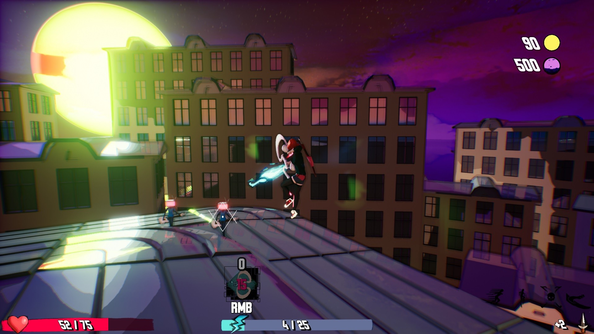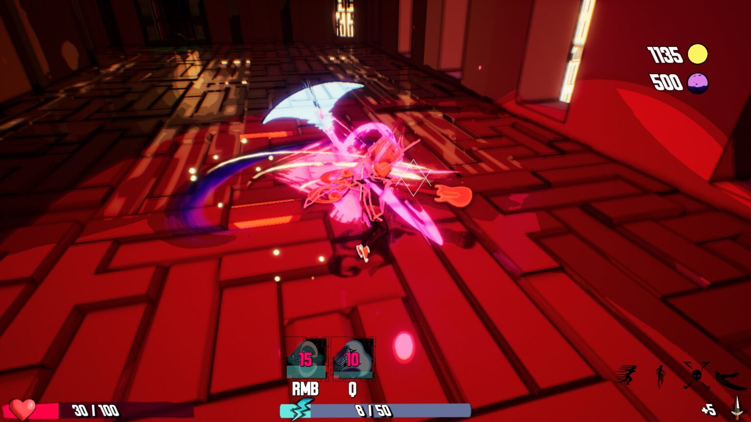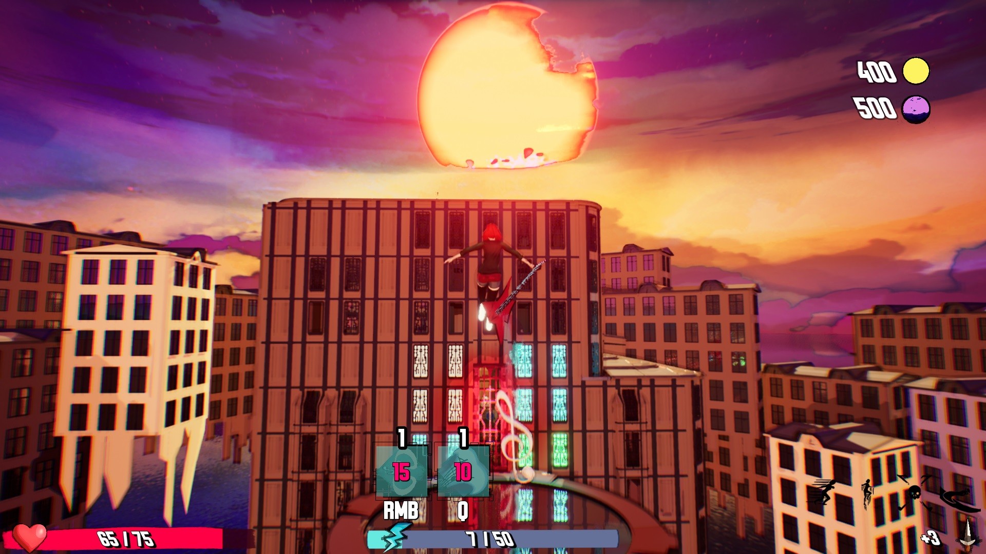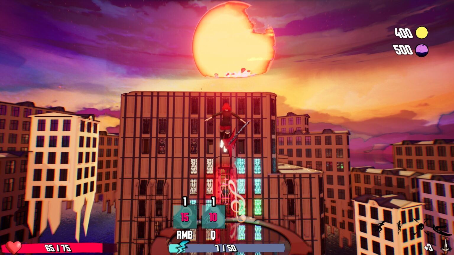 В игре есть как элементы квеста, так и платформинга, но основной геймплей это всё ещё битвы. За каждое сражение вы становитесь сильнее, получая прибавки к статистикам, валюту для прокачки, а также активные способности и пассивные усиления - ваши прыжки могут поджигать противника или бить молнией, а может вы хотите взрывать их просто пробегая мимо? Выбор за вами^^~