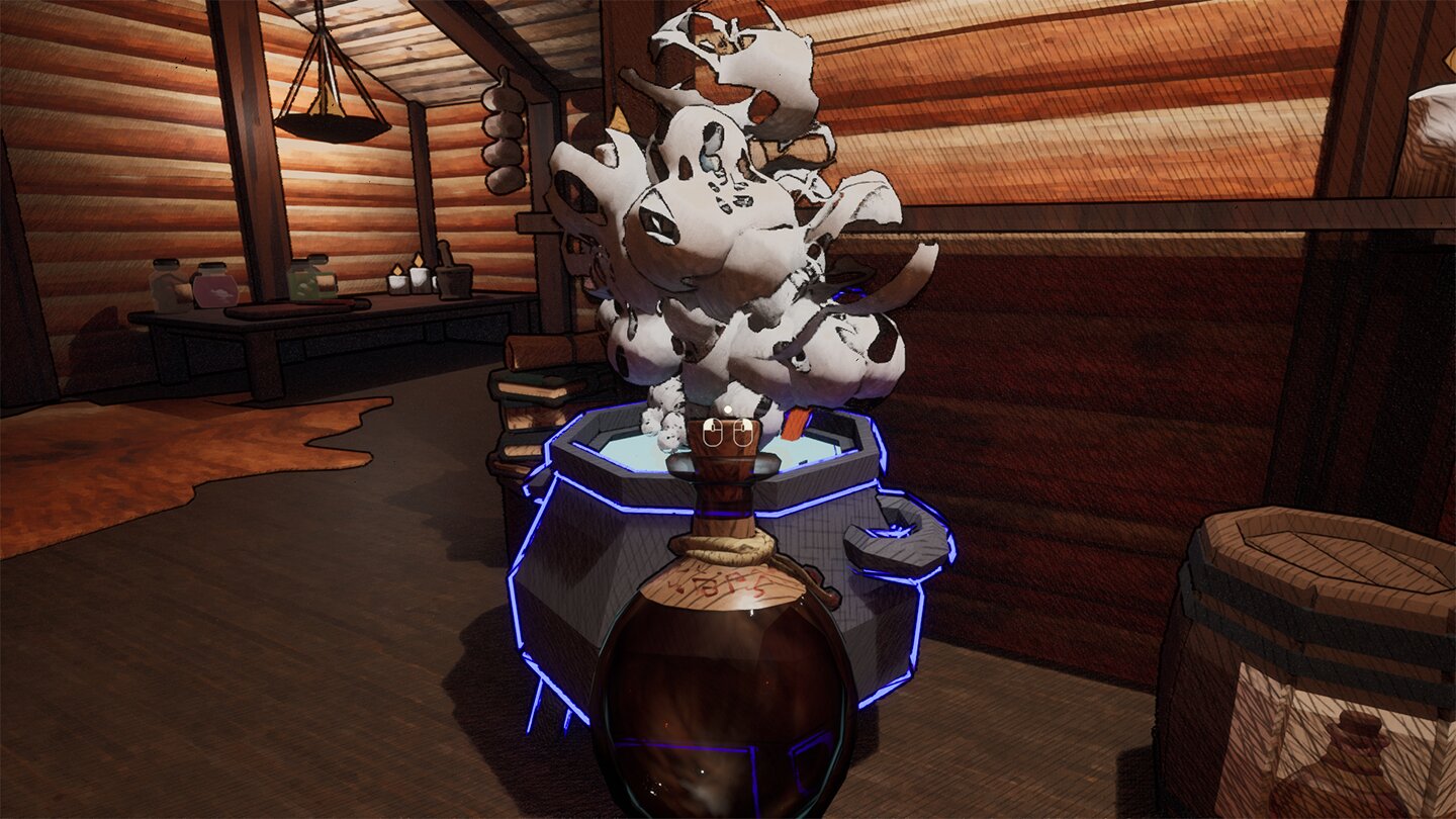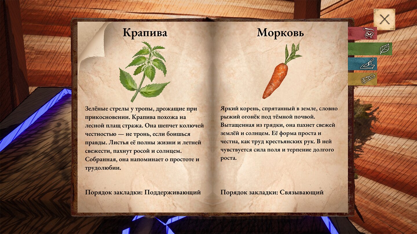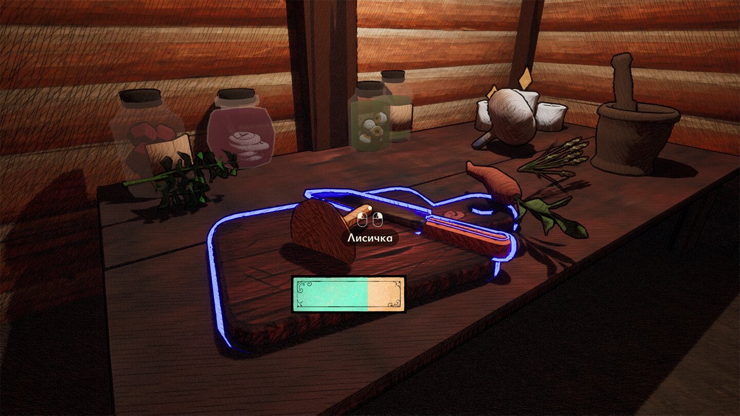 После осмотра игрок работает с Древней книгой зельеварения: подбирает ингредиенты, обрабатывает их и варит зелье. Правильный выбор действий помогает жителям, ошибка влияет на состояние деревни.