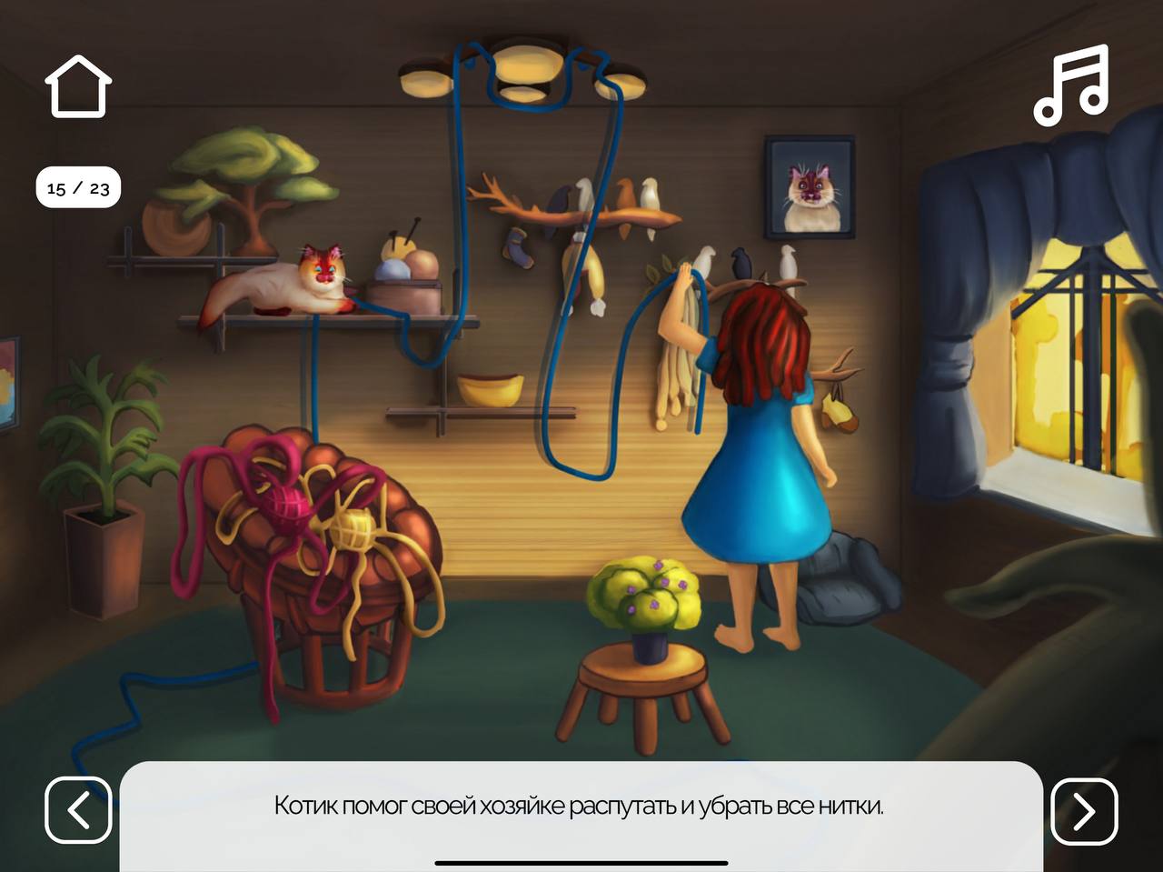 - скорее наблюдение: в той же сказке про котейку интерактивные предметы не очень контрастируют с общим артом, и их было чуточку сложнее найти :) В первой сказке было чуточку попроще с этим.