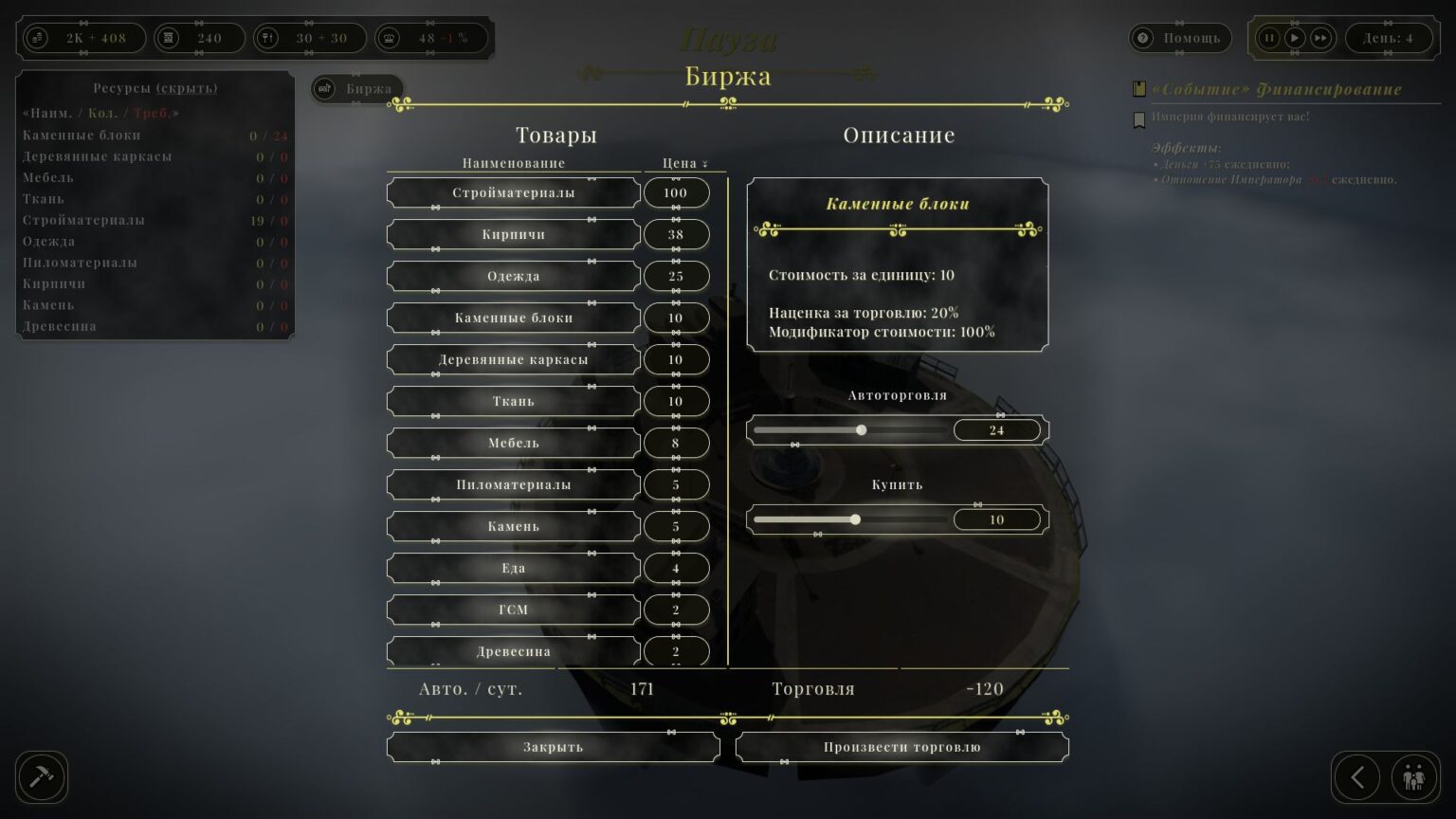 Цены на товары будут меняются от различных мировых событий, ваших действий или просто сиюминутного самодурства Императора. А вам предстоит переживать все новые и новые кризисы вашего производства.