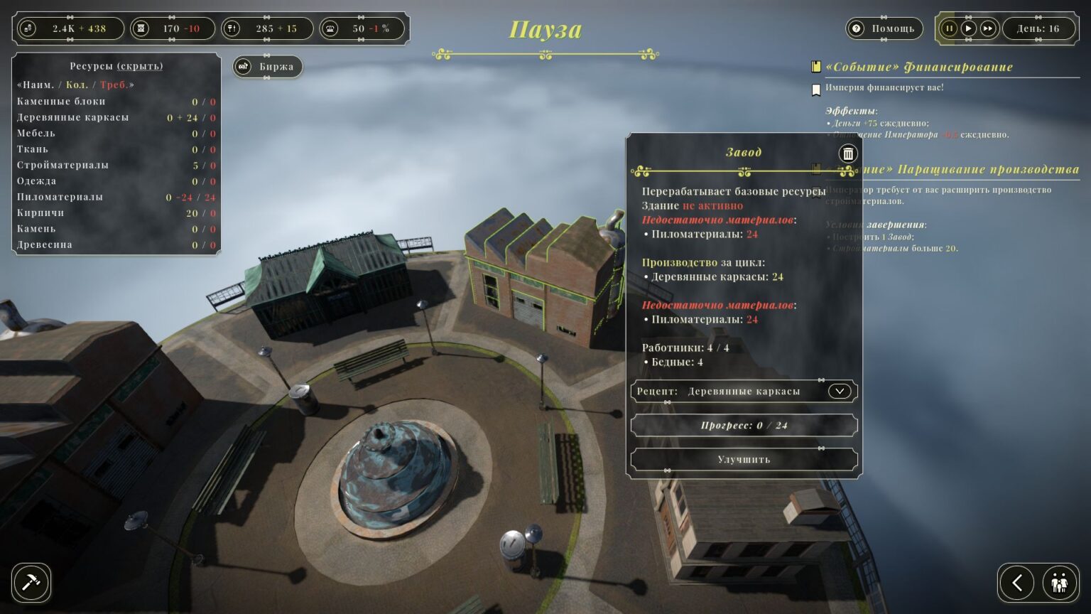 В-третьих, над понятностью и быстрым определением производимых товаров я подумаю, вероятнее всего сделаю режим подсветки рецептов над зданиями, как, например, это реализовано в factorio.