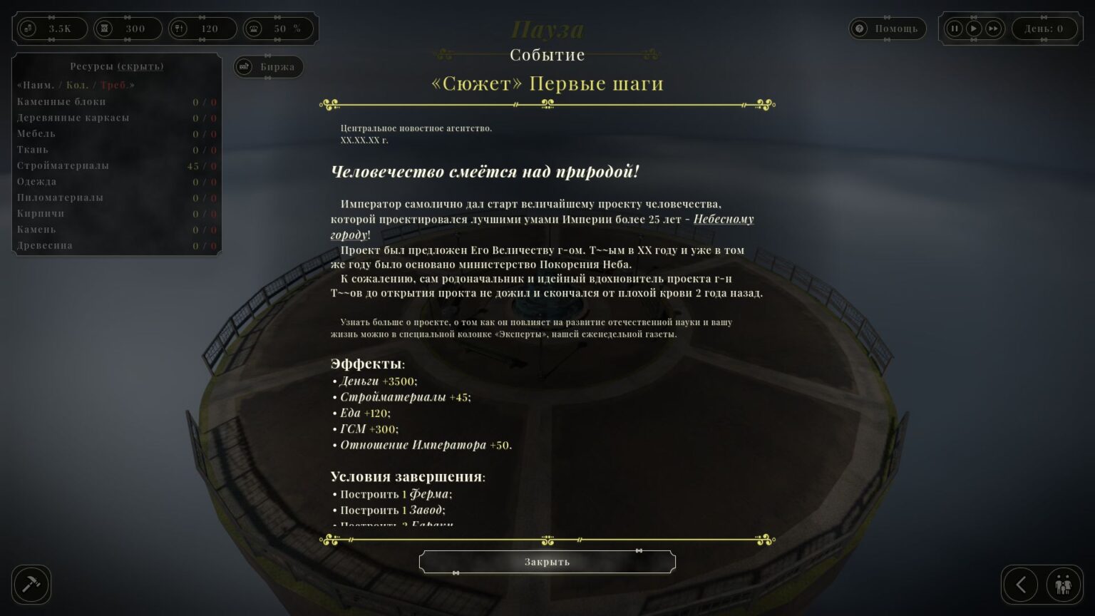 Император назначил вас на должность мэра Небесного города, призванного показать величие единой Империи. Развивайте город, строя новые стоящие высоко в небе сооружения, производственные заводы и жилые помещения.