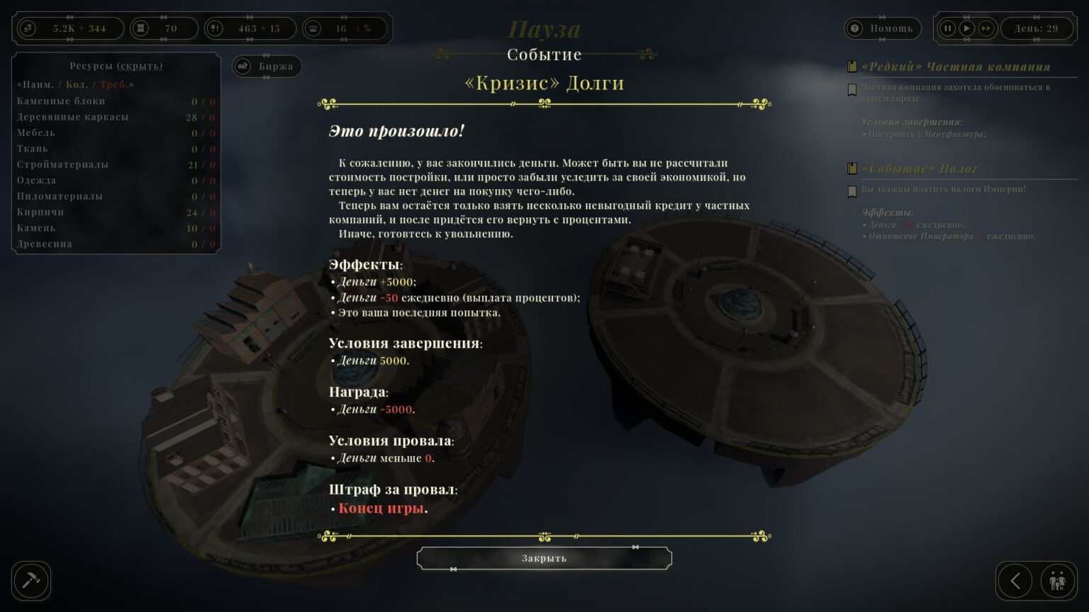 Ну вот и хочется игре дать хорошую оценку и не хочется. Как градостроительная стратегия, пока что нет, слишком мало можно пощупать, но так как это ранняя очень версия, придирок особо нет. Что понравилось, во-первых это события, они часты, они интересны с возможностью выбора. Визуал вполне себе приятный. По поводу самого геймплея, тут ничего нового, строим, следим за ресурсами, торгуем, пытаемся не упасть в грязь лицом как мэр, но император всегда смотрит за тобой, от его взора не скрыться и вот тут не всегда ясны его решения, при одном прохождении, он в самый первый день сказал, что не доволен и уволил меня, в следующий день я залез в долги по максимуму застроил все здания и тут мне никто ничего не сказал, возможно я тут в чём то не разобрался, а возможно баг. Также хотел бы выделить один не приятный момент, когда покупаешь ресурсы случайно проводишь мышкой вниз и ресурс меняется на другой и ты покупаешь не то что хотел, как по мне тут лучше сделать выбор ресурса кликом, а не просто наведением мышки.