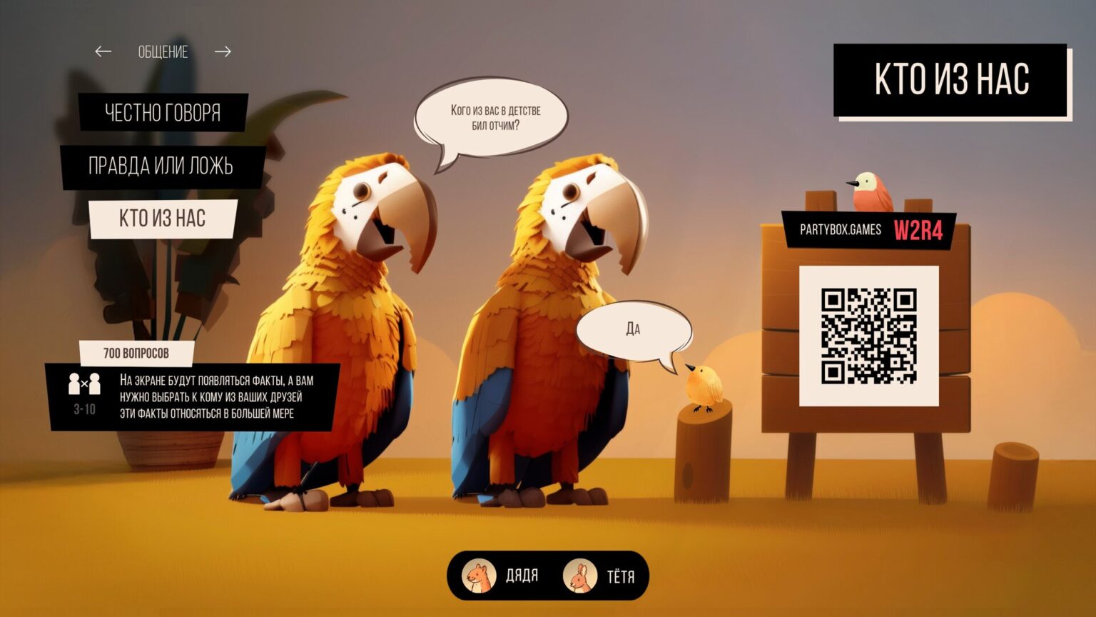 PartyBox — Бесплатная компанейская игра в стиле JackBox без цензуры — для тех, кто не боится острых шуток и неловких моментов. Тысячи озвученных диктором текстов в десятках категорий любимых игр легко превращают обычную вечеринку в бурное обсуждение и споры. Добавляйте свои вопросы и озвучку к ним и смотрите, как друзья раскрываются с неожиданной стороны. Уникальная механика "игроков" и "зрителей", позволяет стримерам играть с сотнями зрителей одновременно. И им не надо для этого скачивать игру.