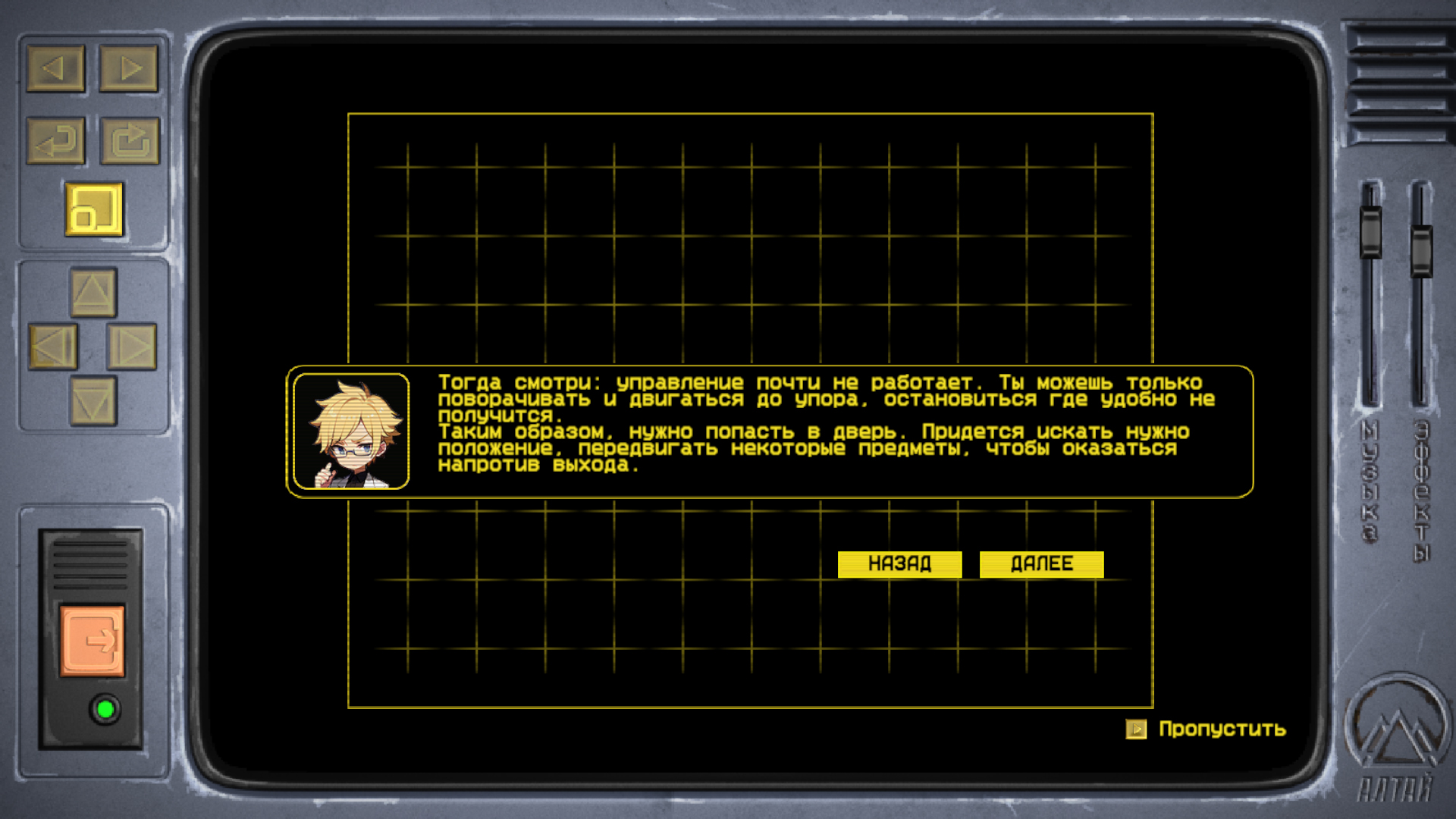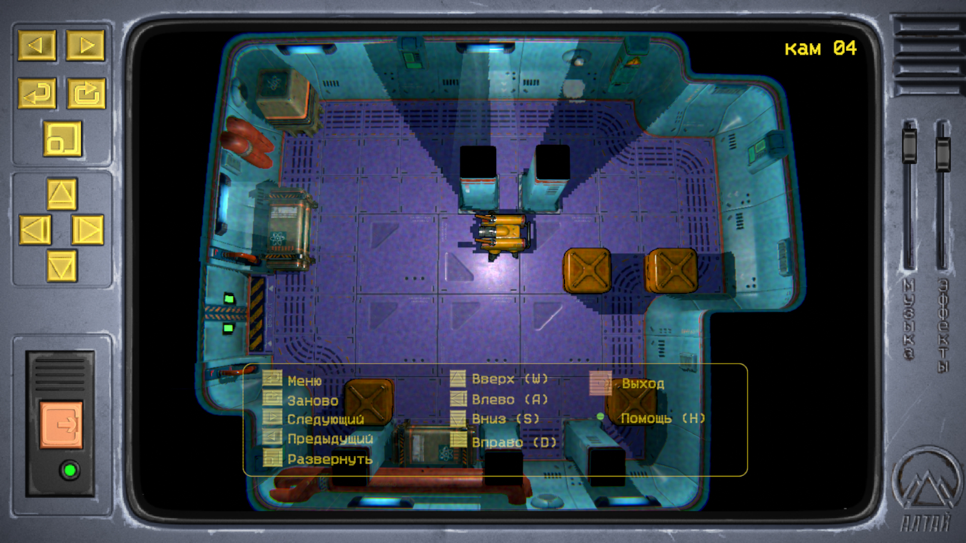 Робот может двигаться от препятствия к препятствию и поворачиваться только когда остановится. Толкая предметы и используя различные выключатели, нужно выбраться из всех комнат.