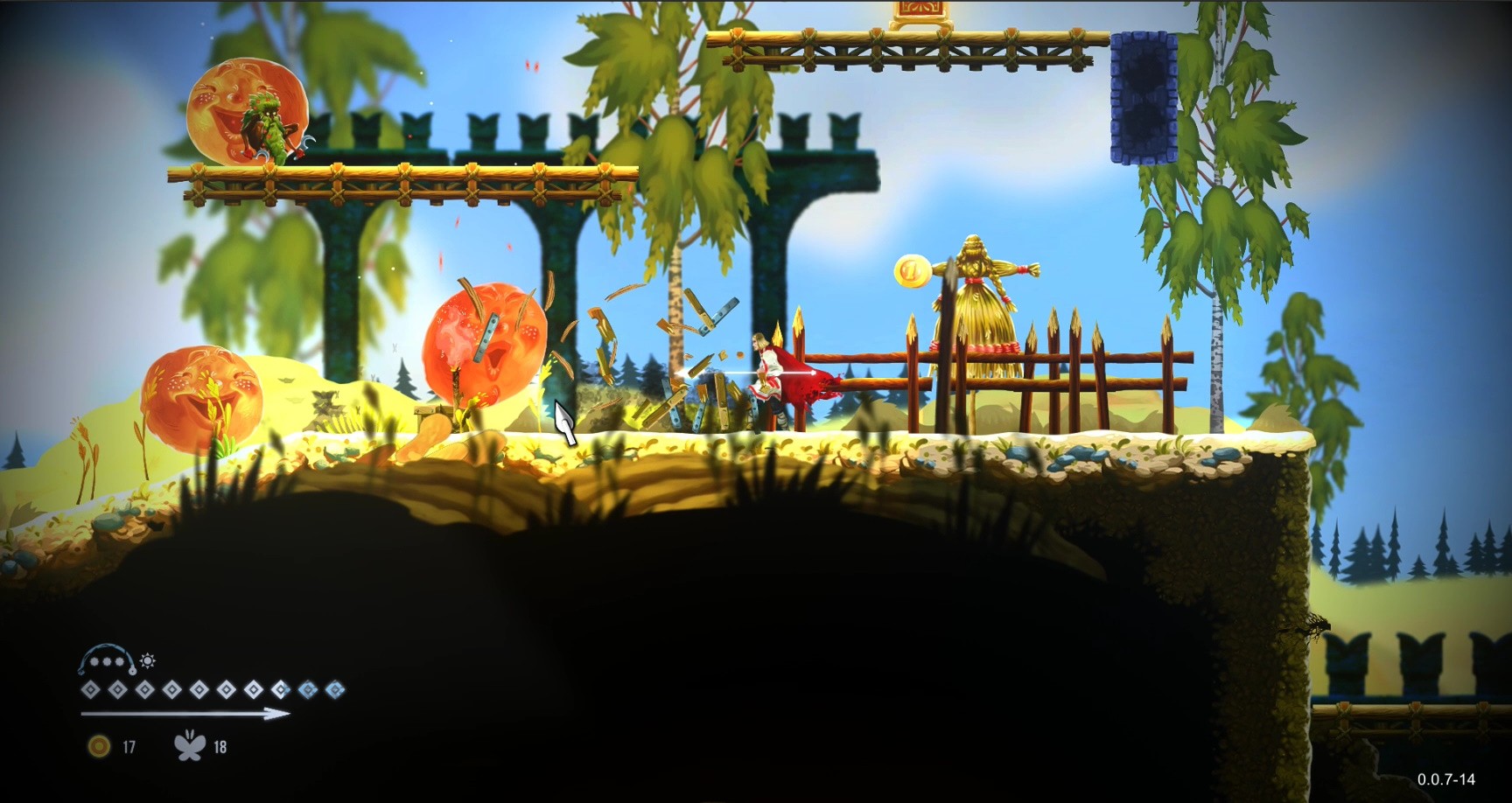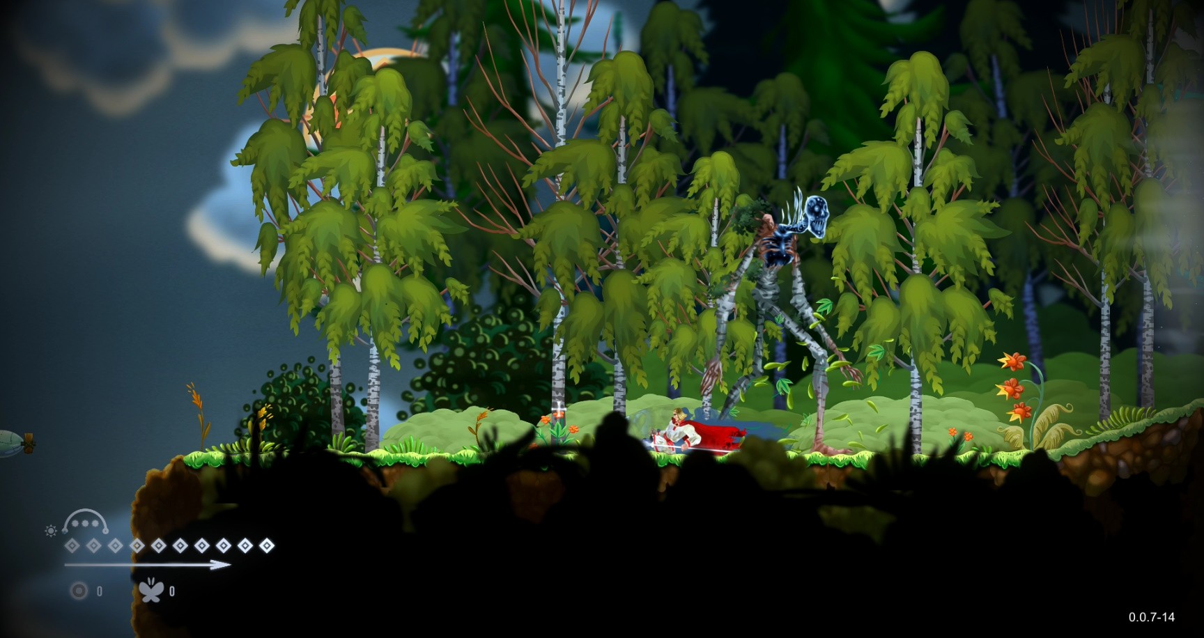 Интересный платформер с весьма насыщенным миром полным фольклорных элементов. Визуально он привлекает цветами окружения, пускай и не всегда можно сказать что они мягкие, и достаточно контрастным выделением важных компонентов. С учётом что большинство элементов здесь модульные, нарисованные и зачастую требовали рисованных анимаций… Это внушительная работа. Работа в Спайн или дракон-бонс для расстановки костей и рига плоских моделей не уменьшает количества труда, вложенного в проект.