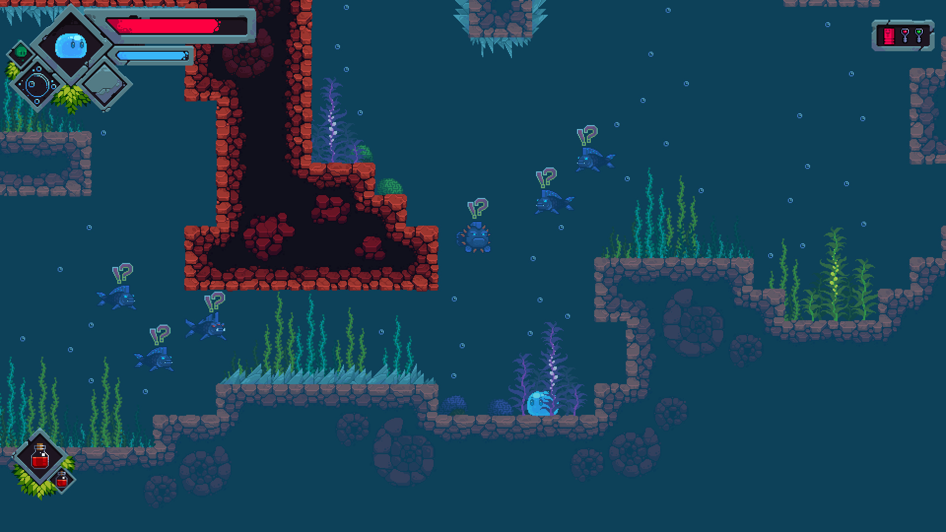 Играла на геймпаде. Никаких подсказок. Так что большую часть времени разбиралась, как вообще играть. Дошла до водяного слизня и так и не поняла, как стать водоплавающим и зачем.