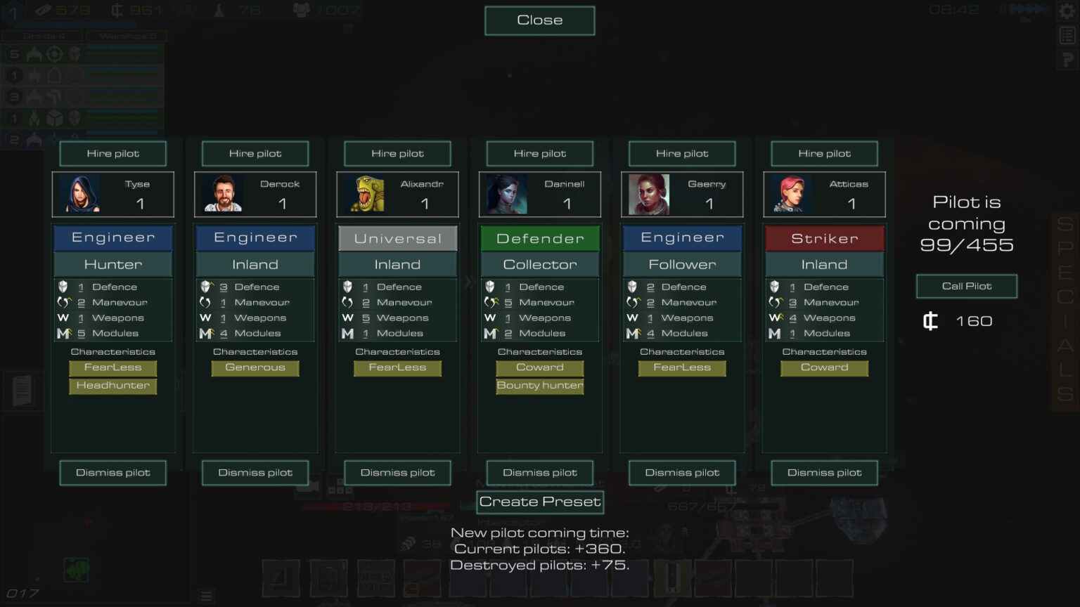 Нанимайте пилотов, каждый из которых обладает своим характером (Охотник, поддержка, домосед и другие) и по разному подходит для выполнения задач.