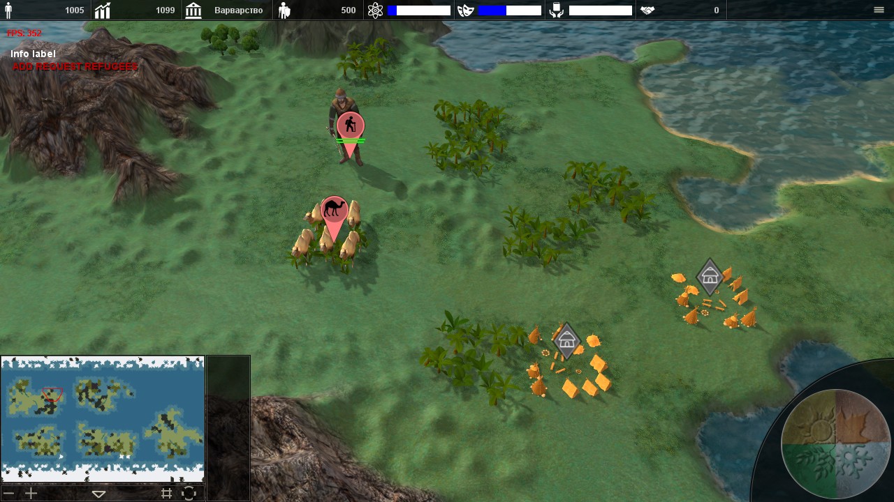 По части визуала проект упрекнуть в чем-то, пока что сложно. Для своего жанра модели юнитов, и окружения выполнены уверенно. Разве что на некоторых животных имеющие 2 модели (львы к примеру) не корректно наложились текстуры. Модельки городов/поселений можно сделать визуально разнообразнее, если ряд зданий в тайле будут иметь различный скейл и поворот. они будут смотреться более живо, и это задаст ритмичное чередование приятное глазу.