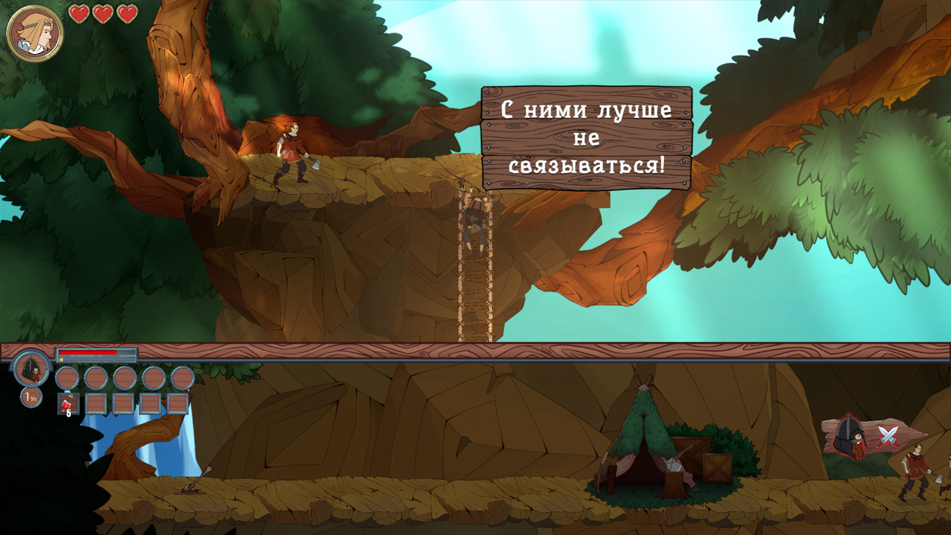 ? Идея/история. Не до конца ясно: кто я, что за воин внизу, почему мы бежим параллельно, и зачем мне ему помогать, почему именно ему нужно продавать всё добытое?